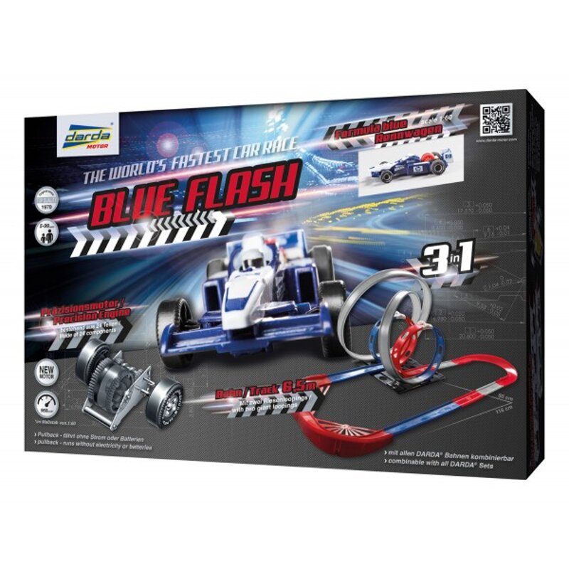 Pista DARDA® "Blue Flash". Playset con quattro loop e un'auto da corsa Formula blu: Lunghezza pista 6,90 m. Adatto a bambini dai 5 anni. La scatola contiene tutte le informazioni dettagliate sul prodotto. 3 varianti costruttive possibili, illustrazioni sul retro della confezione.